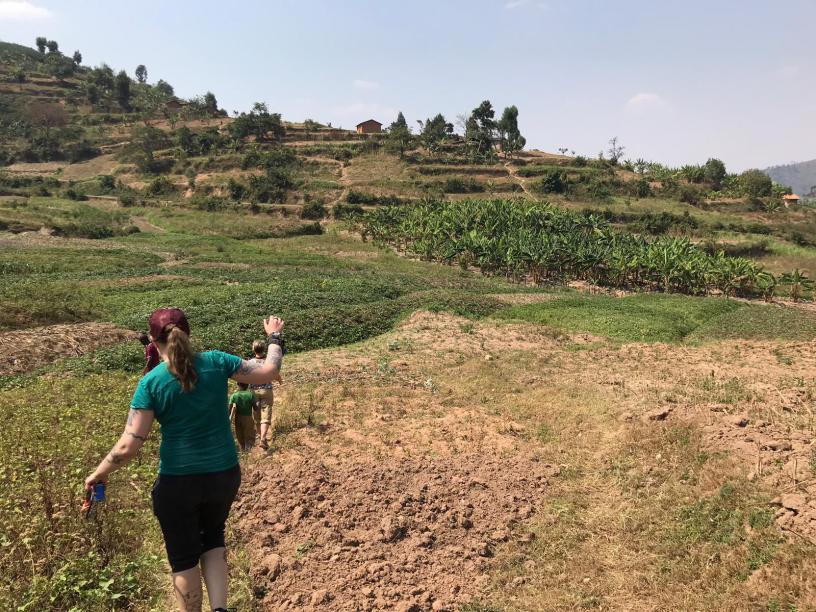 Claudine then gathered the troops and headed us out on a fifteen-minute hike down a hill, across fields of cassava, sweet potato, and banana, and back up another hill, to the fourth house.
